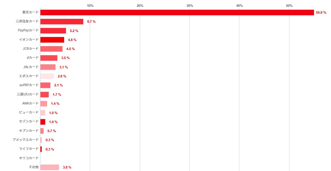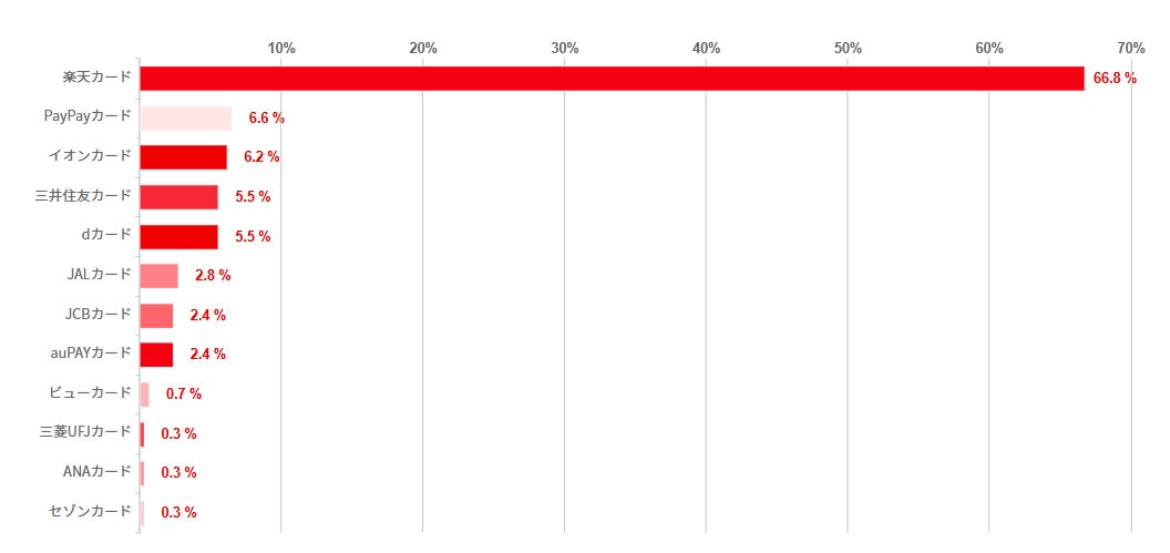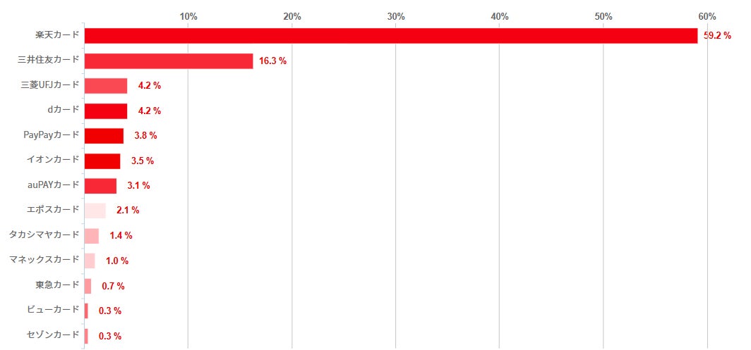 楽天カードが59.2%で過半数を超え、三井住友カードが16.3%でこれに続いた。また、三菱UFJカードとdカードがともに4.2%でその次に多かった。