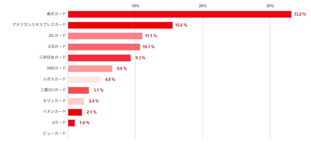 楽天カードが33.2%で最も多く、次にアメリカンエキスプレスカードが15.6%と続いた。また、その他にもJALカードやJCBカードも一定数の票を集めた。