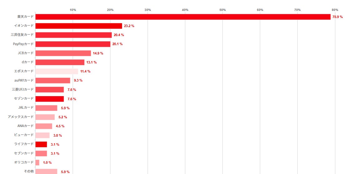 楽天カードが78.9%で最も多く、イオンカードが23.2%でこれに続いた。また、三井住友カードが20.4%で票を集めた他、PayPayカードやJCBカードなどにも一定数の回答があった。