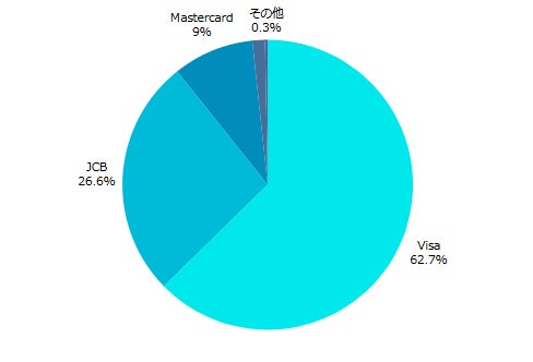 Visaが62.7%で圧倒的多数という結果になった。また、JCBが26.6%、Mastercardが9.0%で続いた。