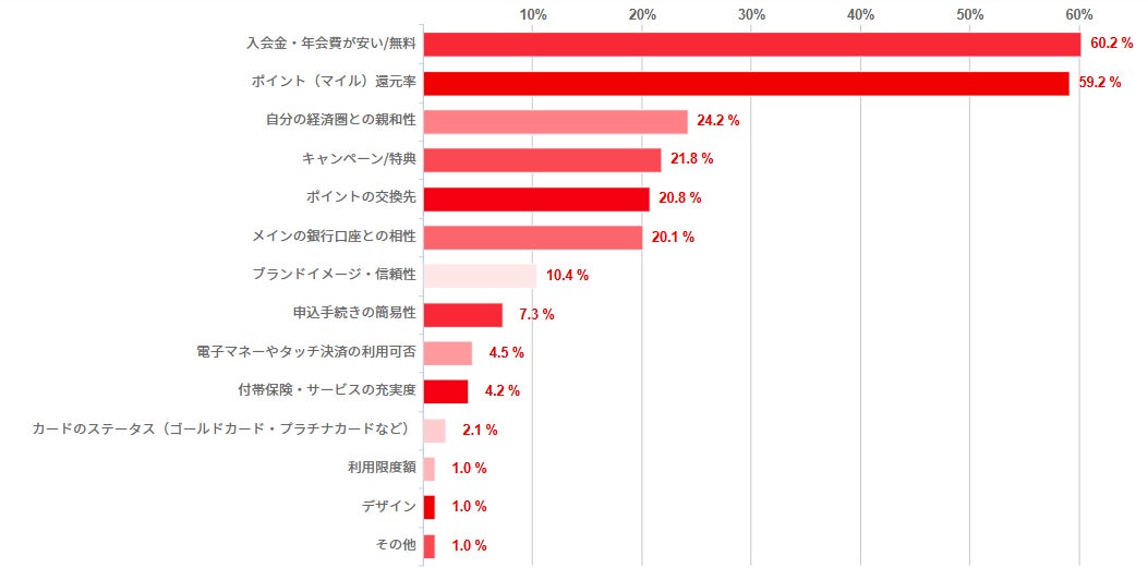 「入会金・年会費の安さ」、および「ポイント(マイル)還元率」を重視している人が圧倒的に多数という結果になった。なお、その他には「自分の経済圏との親和性」や「キャンペーン/特典」を選ぶ人も多かった。