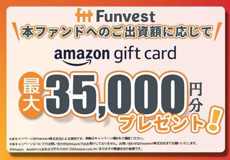 本ファンドへ出資していただいた投資家の皆様を対象として、出資額に応じて最大35,000円分のAmazonギフトカードをプレゼントするキャンペーンも併せて実施いたします。