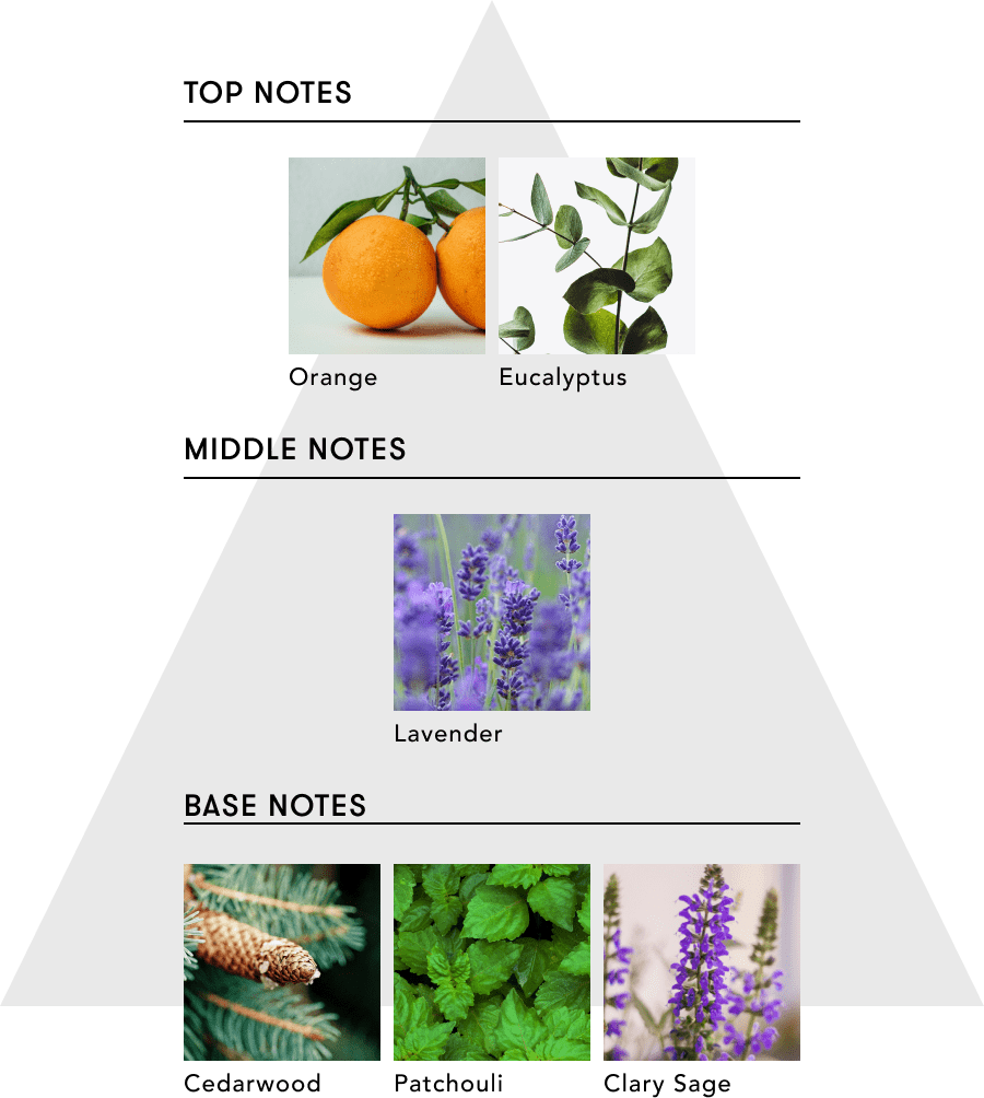 トップはフレッシュで爽やかなユーカリと幸福感を感じるオレンジ、ミドルは心を落ち着かせるラベンダーで変化を感じさせます。長く続くベースノートは、セダーウッド、 パチョリ、クラリセージが森林の中を散歩しているかのように心を洗い流し、緊張や不安をやわらげ、心のバランスを整えてくれます。