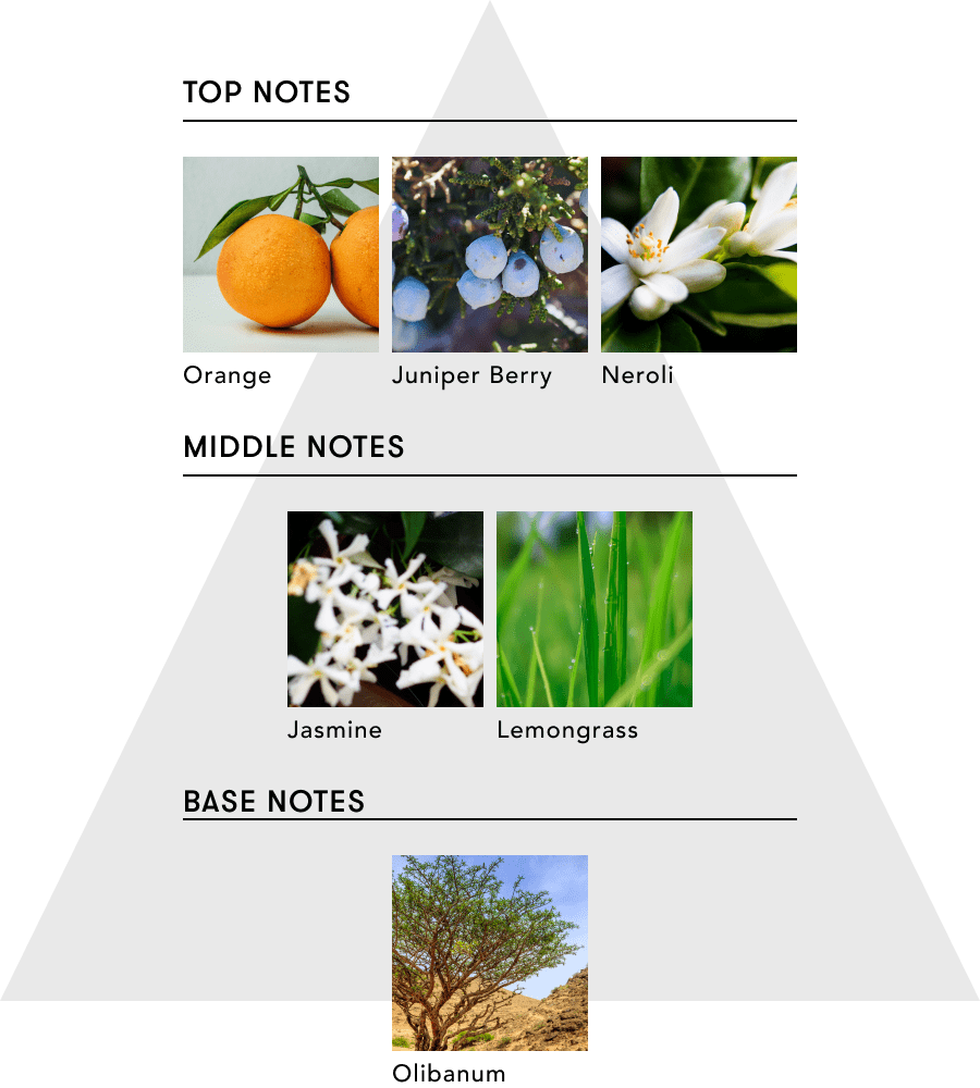 トップは爽やかで瑞々しいオレンジ、ジュニパーベリー、ネロリが気持ちを落ち着かせ前向きな気分にリフレッシュ。ミドルのジャスミンとレモングラスのすっきりとした香りがやる気を高めてくれます。ベースノートのフランキンセンスは、地に足の着いた気品のある香りが心をすーっとクリアに導き、ニュートラルな自分軸にかえしてくれます。