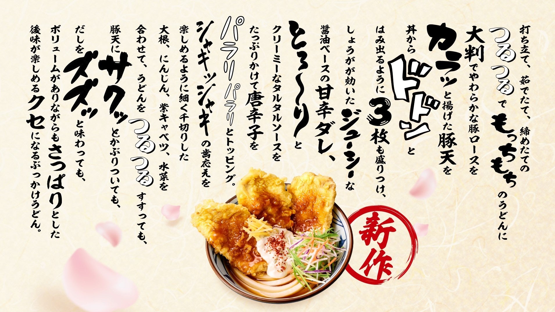 完全新作!大きな豚天3枚とできたてうどんで、おいしさあふれる『甘辛しょうがダレのはみ出る豚天ぶっかけうどん』今年も帰ってきた春の定番!旨みあふれる『山盛りあさりうどん』