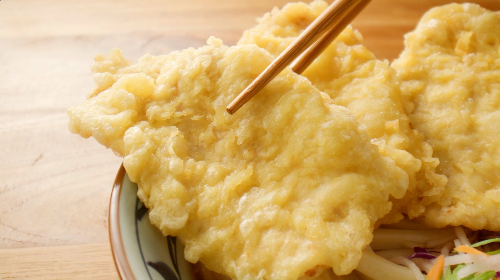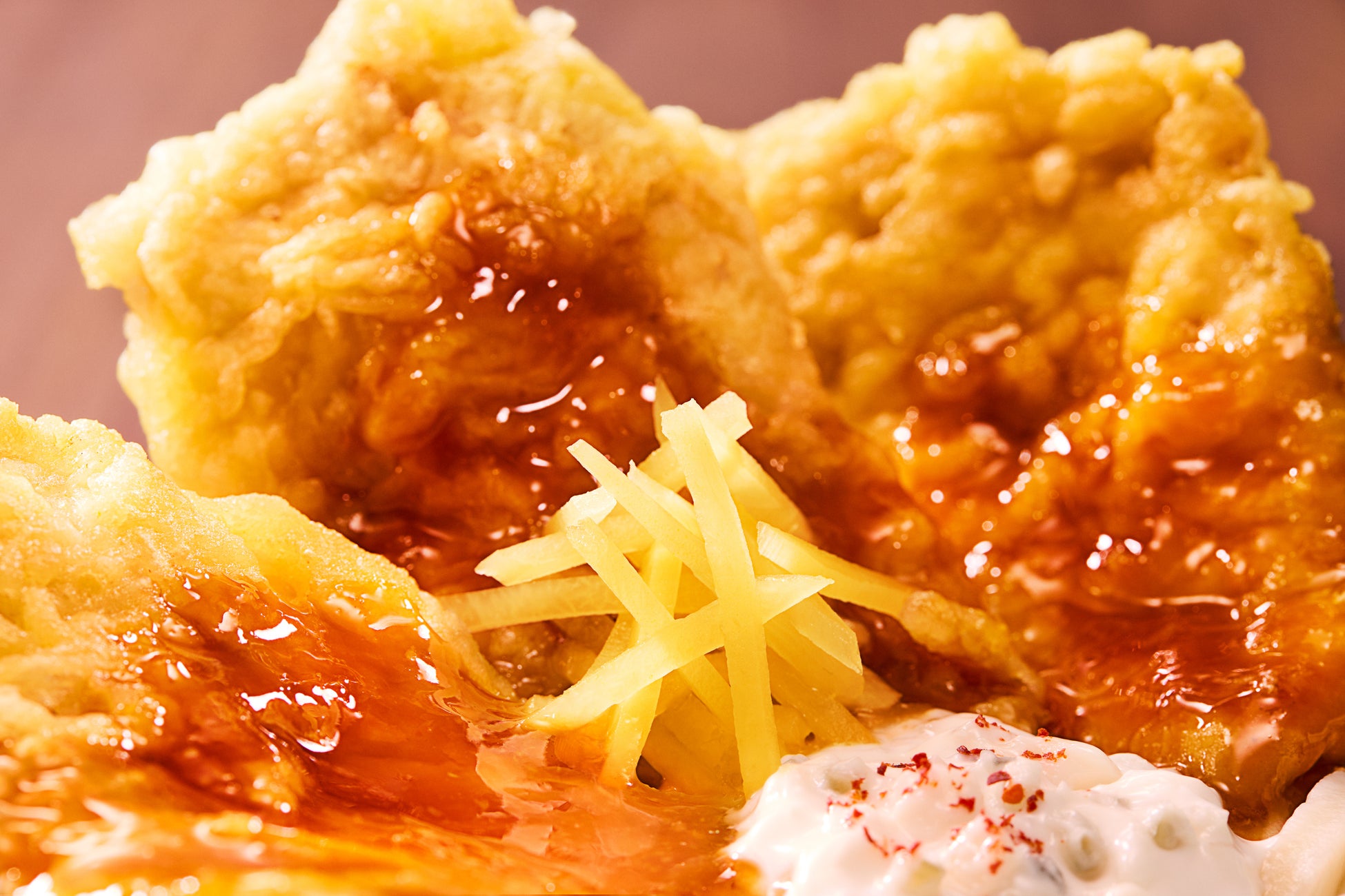 丼からはみ出るほどの大きな豚天が3枚!お店で一枚一枚丁寧に揚げた、揚げたてをご提供します。衣の軽やかなサクサクとした食感と、ほどよい厚みながらもやわらかな豚ロースの旨みが、噛むたびに口いっぱいに広がります。上からかける甘辛いしょうがダレと、まろやかでコクのあるタルタルソースが旨さを引き立てます。さらに、豚ロースは、うどんと一緒に味わうために最適な厚みにこだわっており、打ち立てうどんにからめて頬張ると、箸が止まらぬおいしさです。