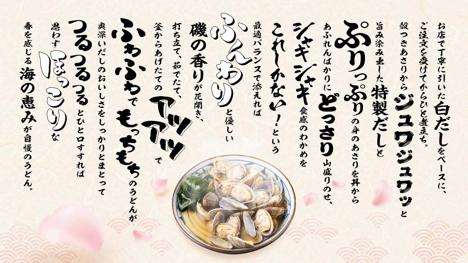 うどんは、茹で釜から直接盛り付ける、茹でたてでもちもち、ふわふわの「釜抜き麺」でご提供します。水で締めないことで表面が毛羽立ち、あさりの旨みがたっぷり染み出ただしがよくからみます。ふわっと香る小麦の香りとともに、あふれんばかりの春のできたてのおいしさをご堪能ください。