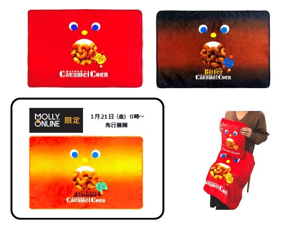 2アイテム共に、人気の味「キャラメルコーン」「ビターキャラメルコーン」「アーモンドキャラメルコーン」の3種類をご用意しています。「キャラメルコーン ブランケットinクッション」の「アーモンドキャラメルコーン」はオンラインクレーンゲーム「モーリーオンライン」限定景品で、先行して1月21日0時より展開いたします。