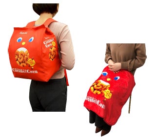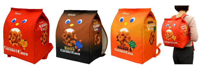 - キャラメルコーンのパッケージを再現したリュックとブランケットをプライズ化