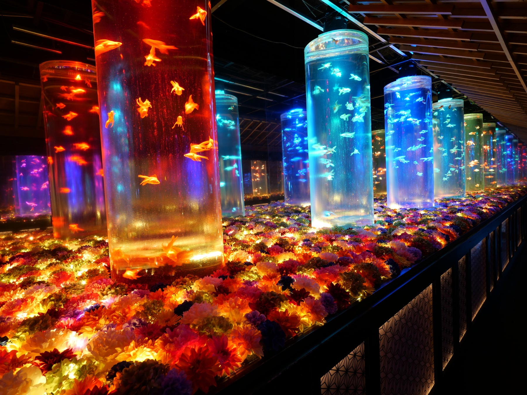 水槽作品“花魁”が並ぶ空間を様々な花で埋め尽くした華やかな空間作品。金魚×花の優美で華やかな空間が広がります。花に囲まれる、没入空間をお楽しみください。