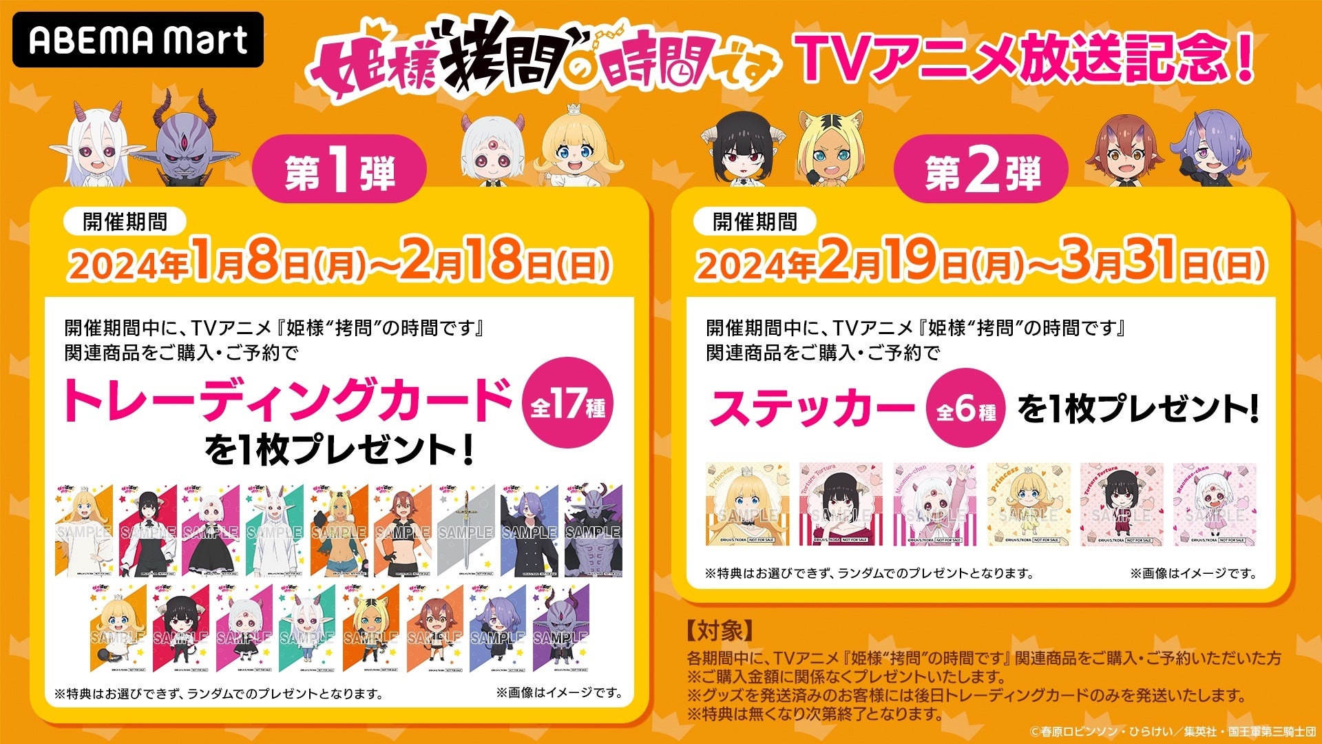 また、「ABEMA Mart」限定特典も決定。「ABEMA Mart」のアニメ『姫様“拷問”の時間です』特設ショップにて、販売中のグッズいずれかを購入・予約された方を対象に、1月8日(月・祝)から2月18日(日)の第1弾では「トレーディングカード(全17種) 」を、2月19日(月)から3月31日(日)の第2弾では「ステッカー(全6種) 」をいずれか1つをランダムでプレゼントいたします。