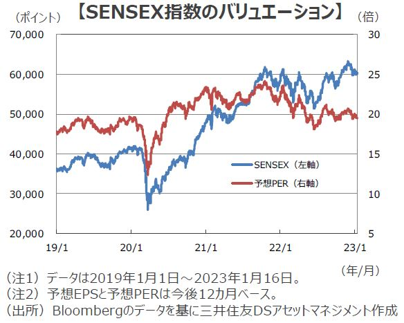 ■ブルームバーグによれば、SENSEX指数の今後12カ月の予想1株当たり利益(EPS)は増加を続けている一方、米S&P500種指数の予想EPSは、22年7月以降減少傾向が続いています。この企業業績の見通しの違いが、22年の株価パフォーマンスに現れたとみられます。