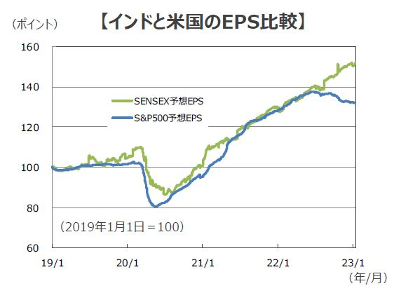 ■23年のインドの『企業業績』見通しは堅調です。より銘柄数の多い株価指数「MSCI INDIA」の予想EPSでみても、前年比+19%と高い伸びが見込まれています(ファクトセット、1月16日)。これは米S&P500種指数の予想EPSの同+4%を大きく上回っています。