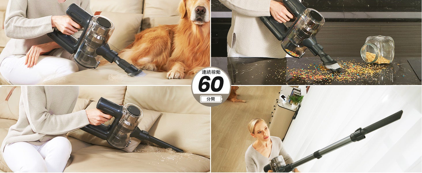 P12コードレス掃除機は、フローリング、畳、カーペット、ソファー、カーテン、車用など、さまざまな場所で活躍することができます。さらに、弱モードで約60時間連続稼働が可能なので、一度の充電でたっぷりと使えます。