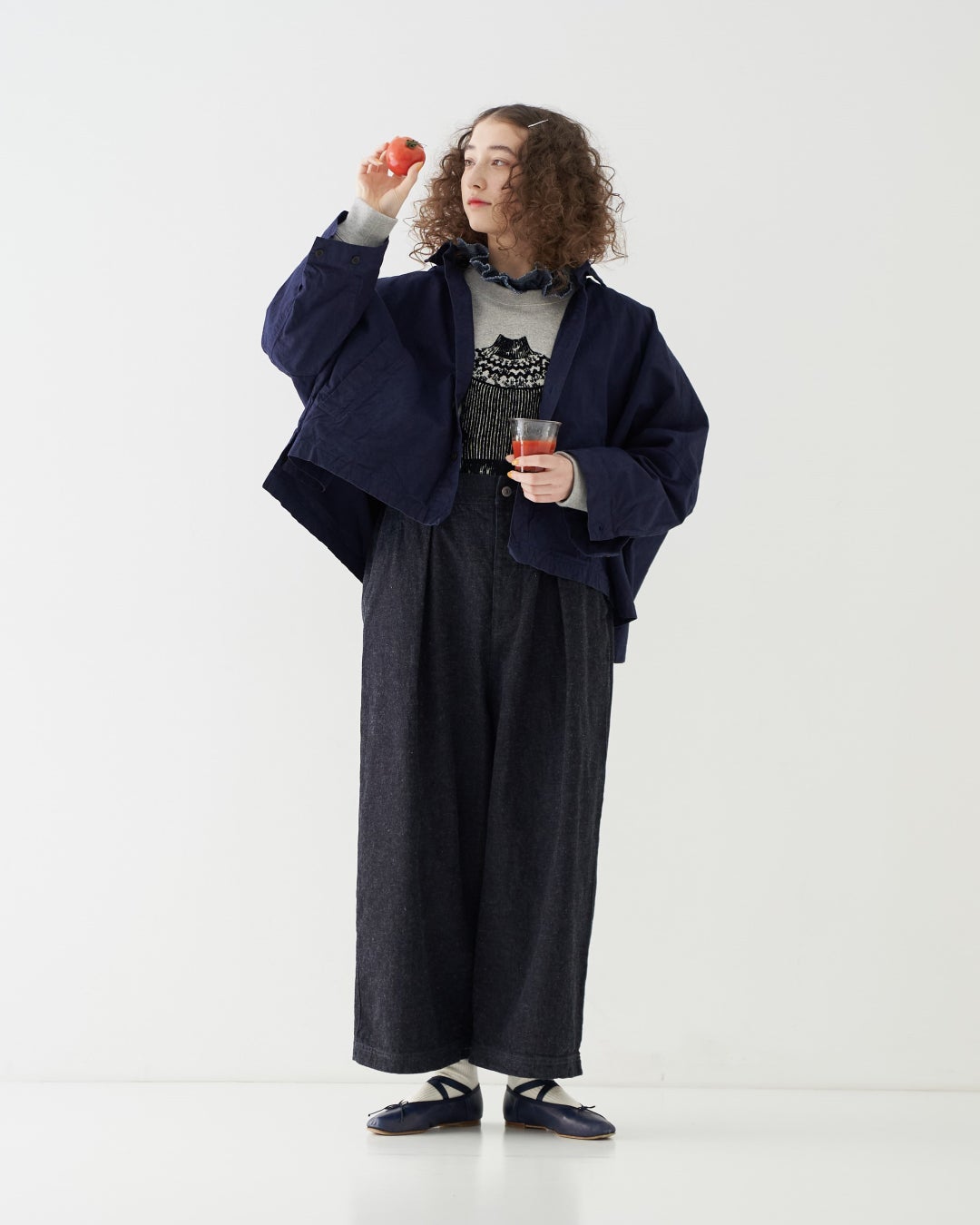 色によって加工方法が異なり、「ネイビー」は製品の状態で染色する「製品染め」を採用し、色ムラやアタリが生まれヴィンテージのような味わい深い風合いに。「生成」は、無染色で素材そのものの色味を活かした肌馴染みのよいナチュラルな雰囲気に仕上げました。