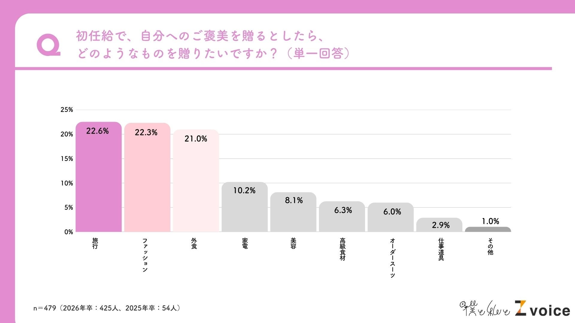 次に、初任給で「自分へのご褒美」を贈るとしたら具体的に何に使いたいかを尋ねたところ、男女ともに「旅行(22.6%)」「ファッション(22.3%)」「外食(21.0%)」が上位を占めました。