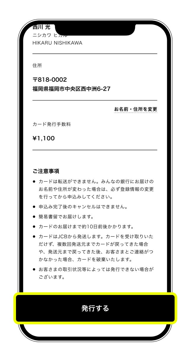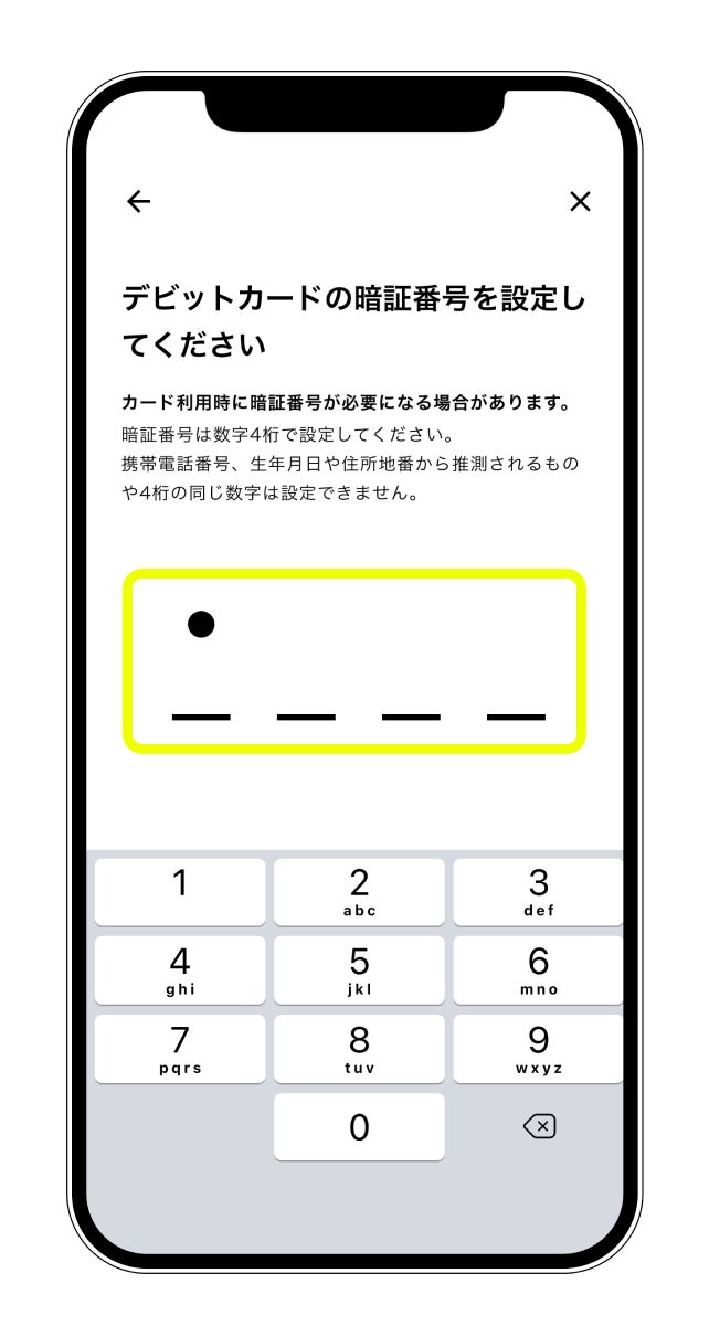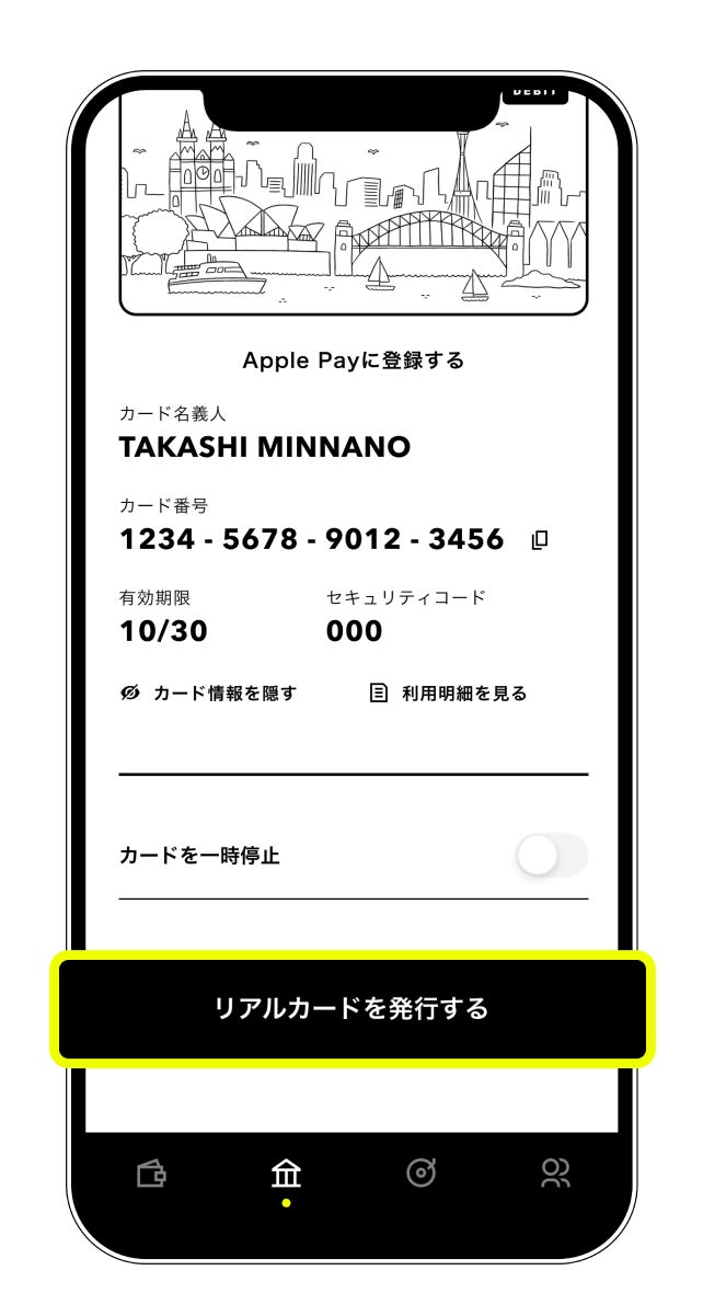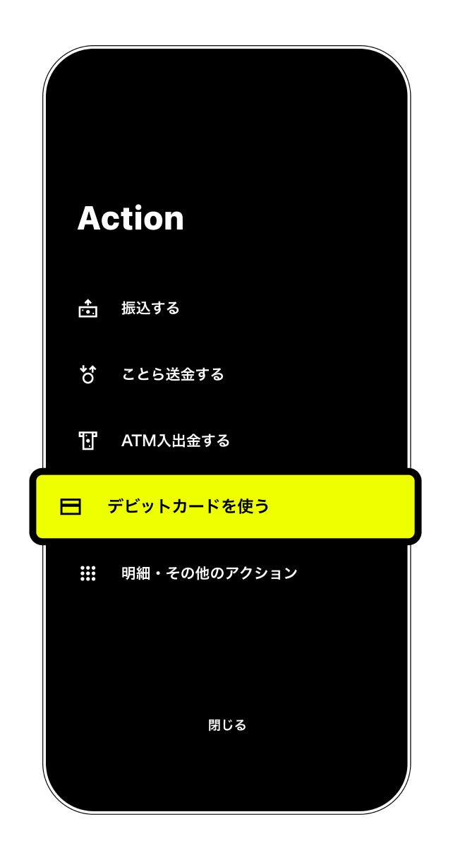 *3 口座開設直後のお客さまは、リアルカード申込みのためのデータ反映までに2営業日(銀行営業日)要します。3営業日(銀行営業日)以降にアプリ内「デビットカードを使う」画面より「リアルカードを発行する」を押下してお申込みください。