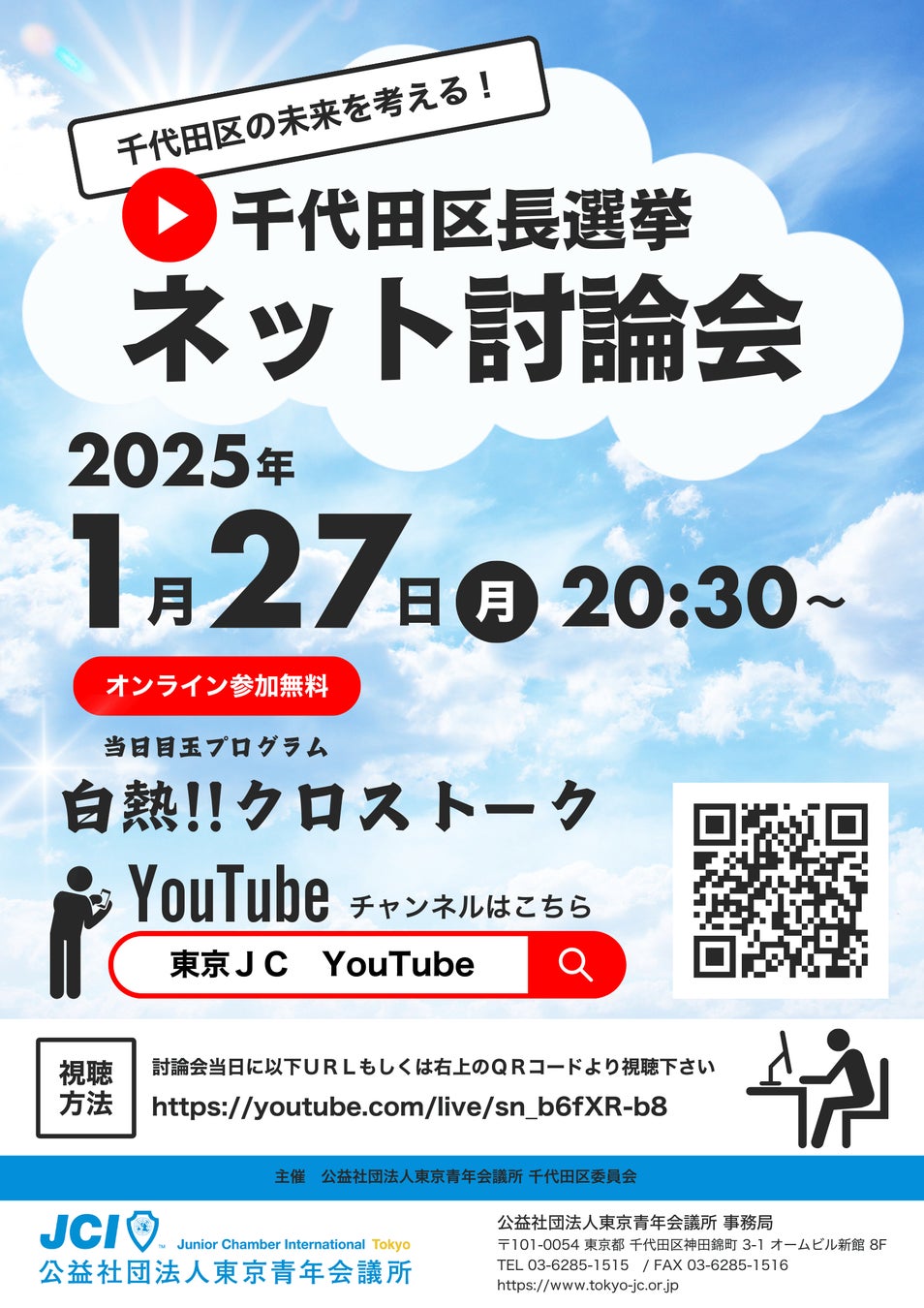 公益社団法人東京青年会議所(以下、東京JC)千代田区委員会は、千代田区長選挙のネット討論会を2025年1月27日(月)に開催します。討論会の様子を20:30より東京JC公式YouTubeチャンネルにて生配信いたします。(後日、東京JC公式YouTubeチャンネルにてアーカイブ配信も予定しております)