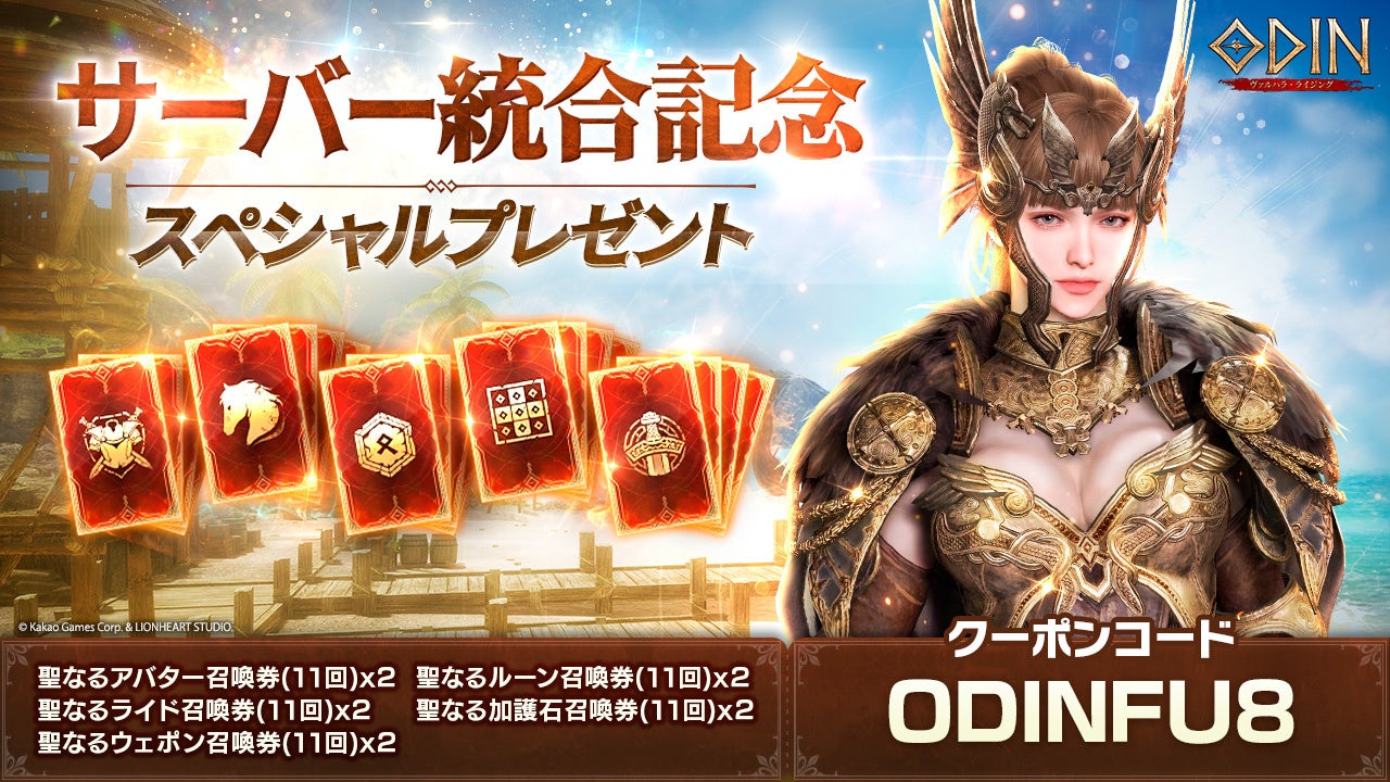 『オーディン:ヴァルハラ・ライジング』の公式X(旧Twitter)では、サーバー統合を記念し豪華な報酬が含まれている特別クーポンを用意いたしました。
