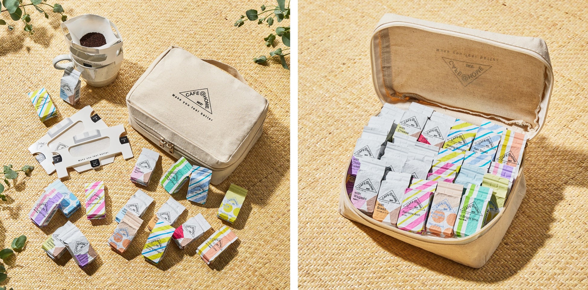 CAFE@HOME with Fruit Sweets フルーツ系スイーツと 10g ×2 CAFE@HOME with Chocolate Sweets チョコレート系スイーツと 10g ×2 CAFE@HOME with Cheese Sweets チーズ系スイーツと 10g ×2 CAFE@HOME with Wagashi 和菓子と 10g ×2 CAFE@HOME with Milk ミルクと楽しむコーヒー 10g ×2 CAFE@HOME with Bread パンと楽しむコーヒー 10g ×2 CAFE@HOME Shining Sunlight 晴れの日に 10g ×2 CAFE@HOME Rain Sound 雨の日に10g ×2 CAFE@HOME Rainbow Arch 虹の日に 10g ×2 CAFE@HOME Decaf Empathy 思いやりを 10g ×1 CAFE@HOME Decaf Break ひと休みを 10g ×1 CAFE@HOME Decaf Deep Breath 深呼吸を 10g ×1 CAFE@HOME in Start time 始まりの時間に 10g ×1 CAFE@HOME in Bright time 明るい時間に 10g ×1 CAFE@HOME in Twilight time 黄昏の時間に 10g ×1 1杯分のコーヒーフィルター(3枚入り)×8 <非売品>CAFE@HOMEオリジナルコットントラベルポーチ×1 |