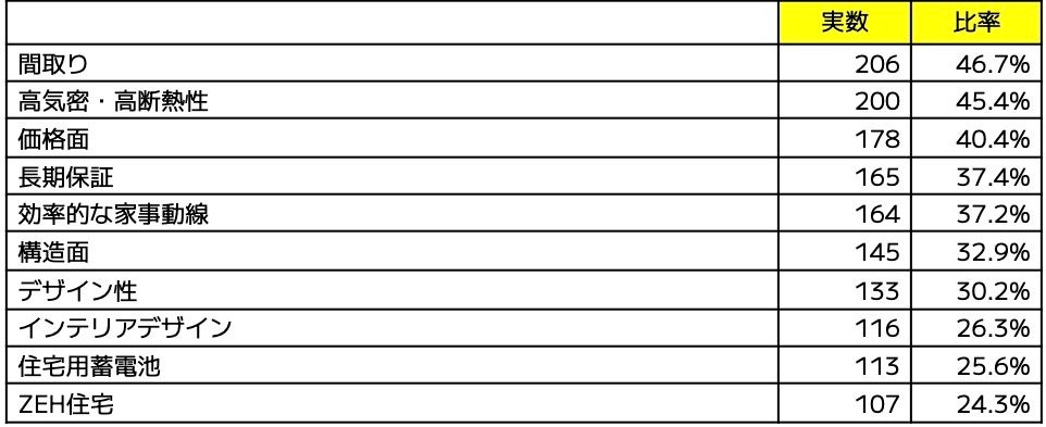 1位:「間取り」(46.7%)、2位:「高気密・高断熱性」(45.4%)、3位:「価格面」(40.4%)、4位:「長期保証」(37.4%)、5位:「効率的な家事動線」(37.2%)