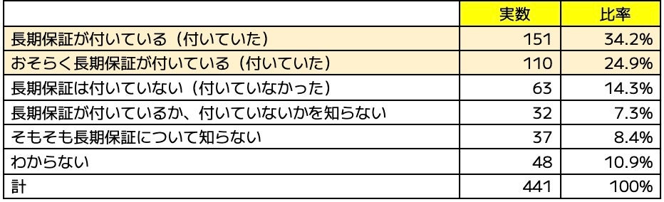 「長期保証が付いている(ていた)」(34.2%)、「おそらく長期保証が付いている(ていた)」(24.9%)=合算すると59.1%が長期保証がついていたと回答