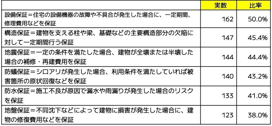 「設備保証」(50.0%)、「構造保証」(45.4%)、「地震保証」(44.4%)、「防蟻保証」(43.2%)、「防水保証」(41.0%)、「地盤保証」(38.0%)と横並びの結果