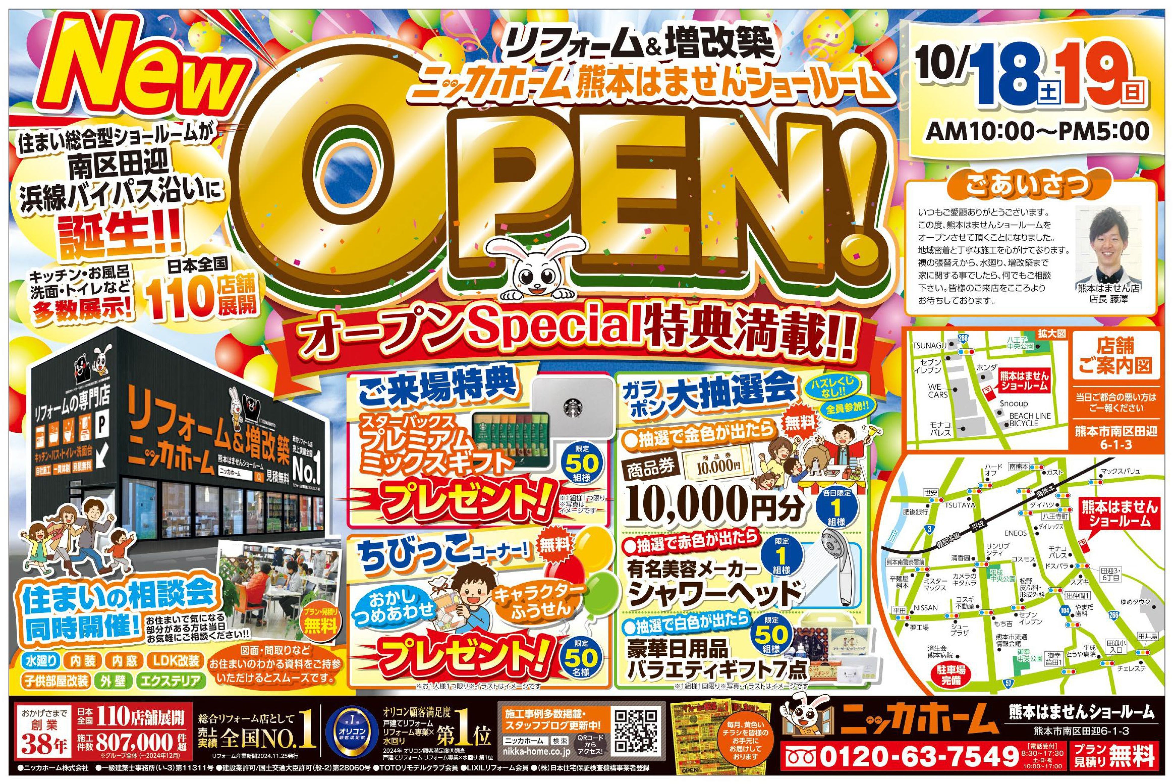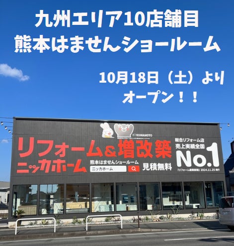 住宅リフォーム事業を手掛ける ニッカホーム株式会社(本社:愛知県名古屋市緑区篭⼭、代表取締役社長:西田裕久、以下 ニッカホーム)が、九州エリアにて、熊本県内2店舗目となる、ニッカホーム熊本はませんショールーム を、2025年10月18日(土)よりニューオープン!