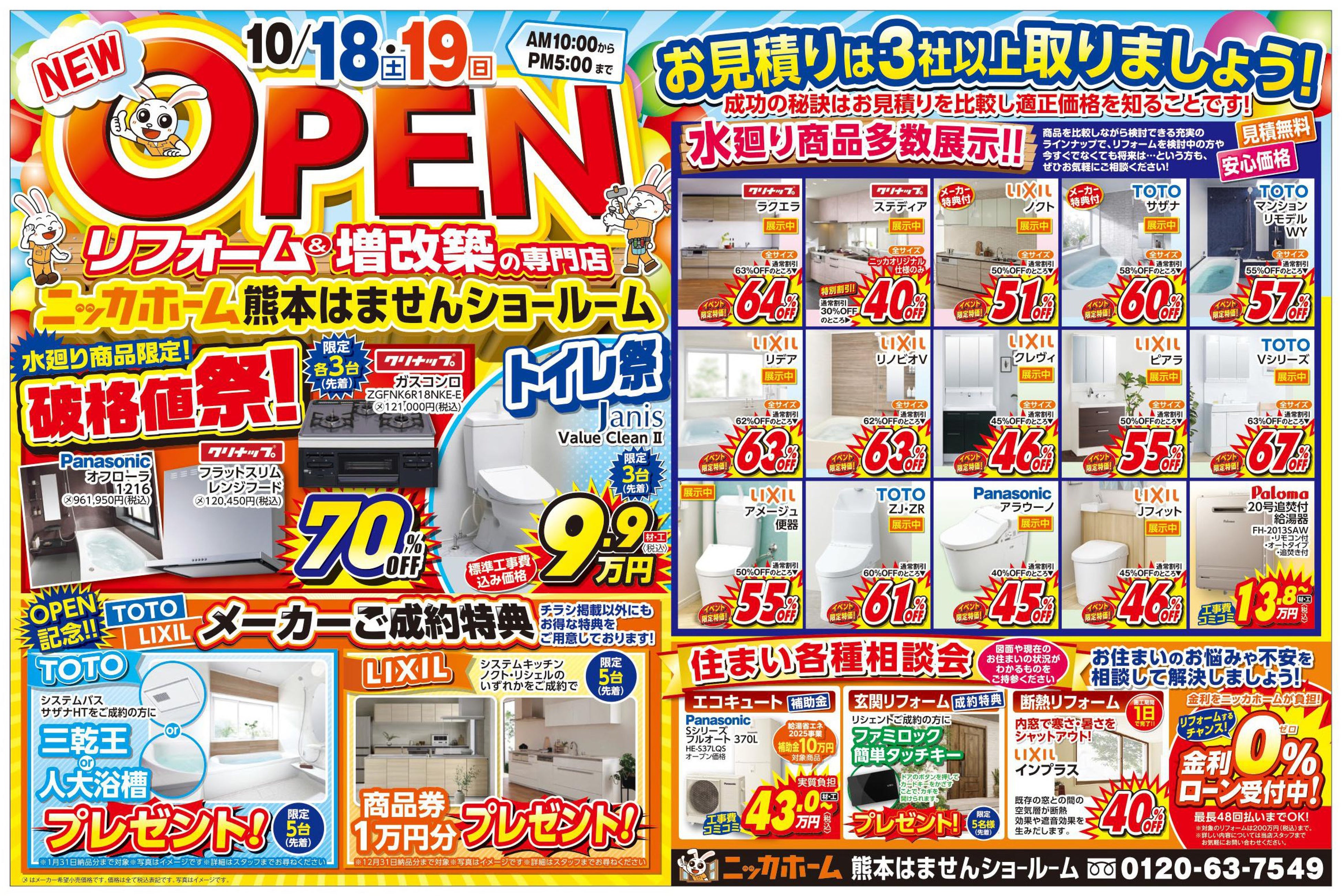 Panasonicの浴室やフラットスリムレンジフード、ガスコントが70%OFF、ジャニスのトイレが材工共9.9万円(税込)と人気商品が破格値で手に入るチャンスです!