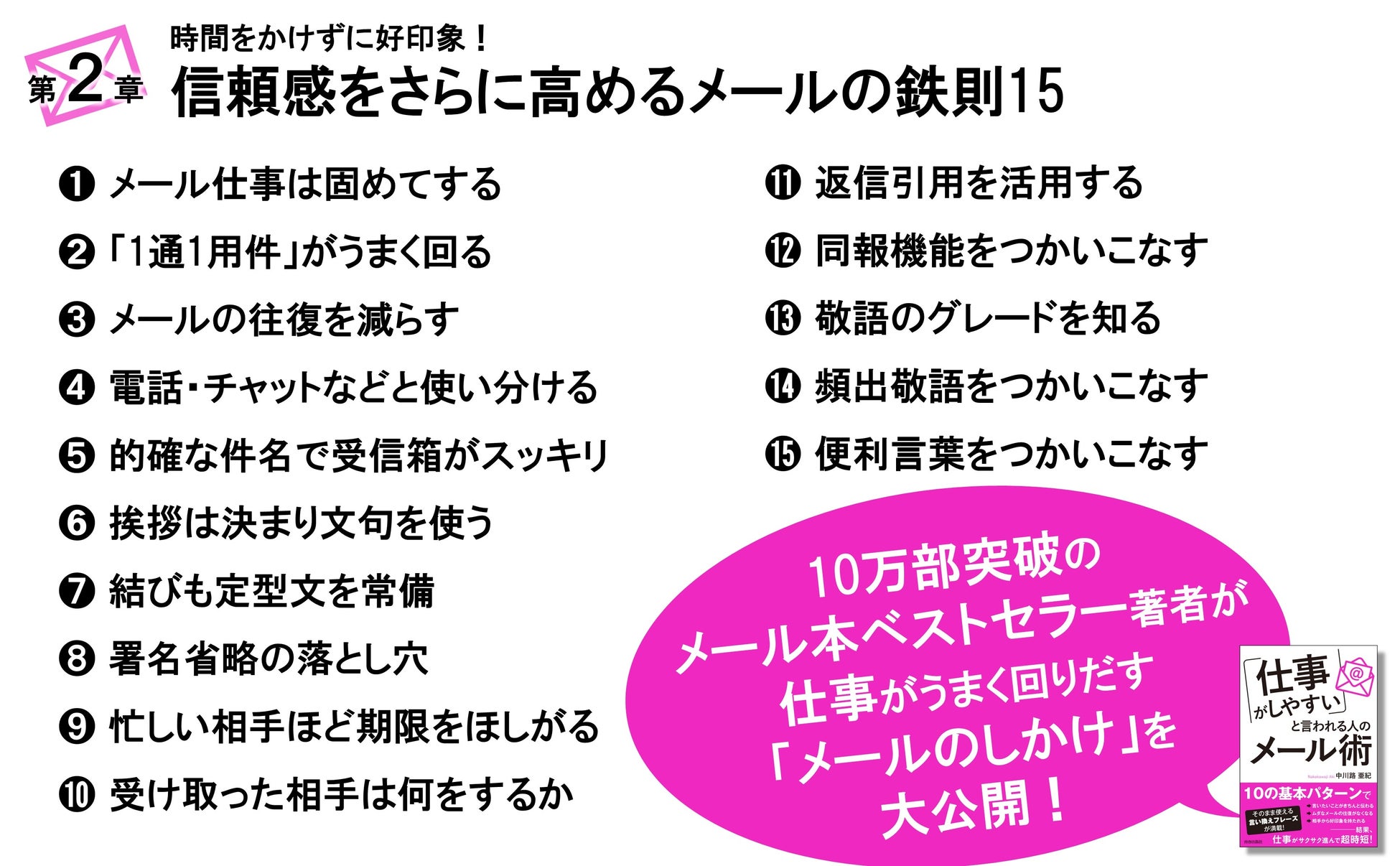 メール本のベストセラー著者・中川路亜紀氏による、メールを効率化し、相手からの信頼をさらに高める15の鉄則も公開。メールにかける時間がグンと減るだけでなく、仕事をサクサク進めるノウハウが満載の一冊です。