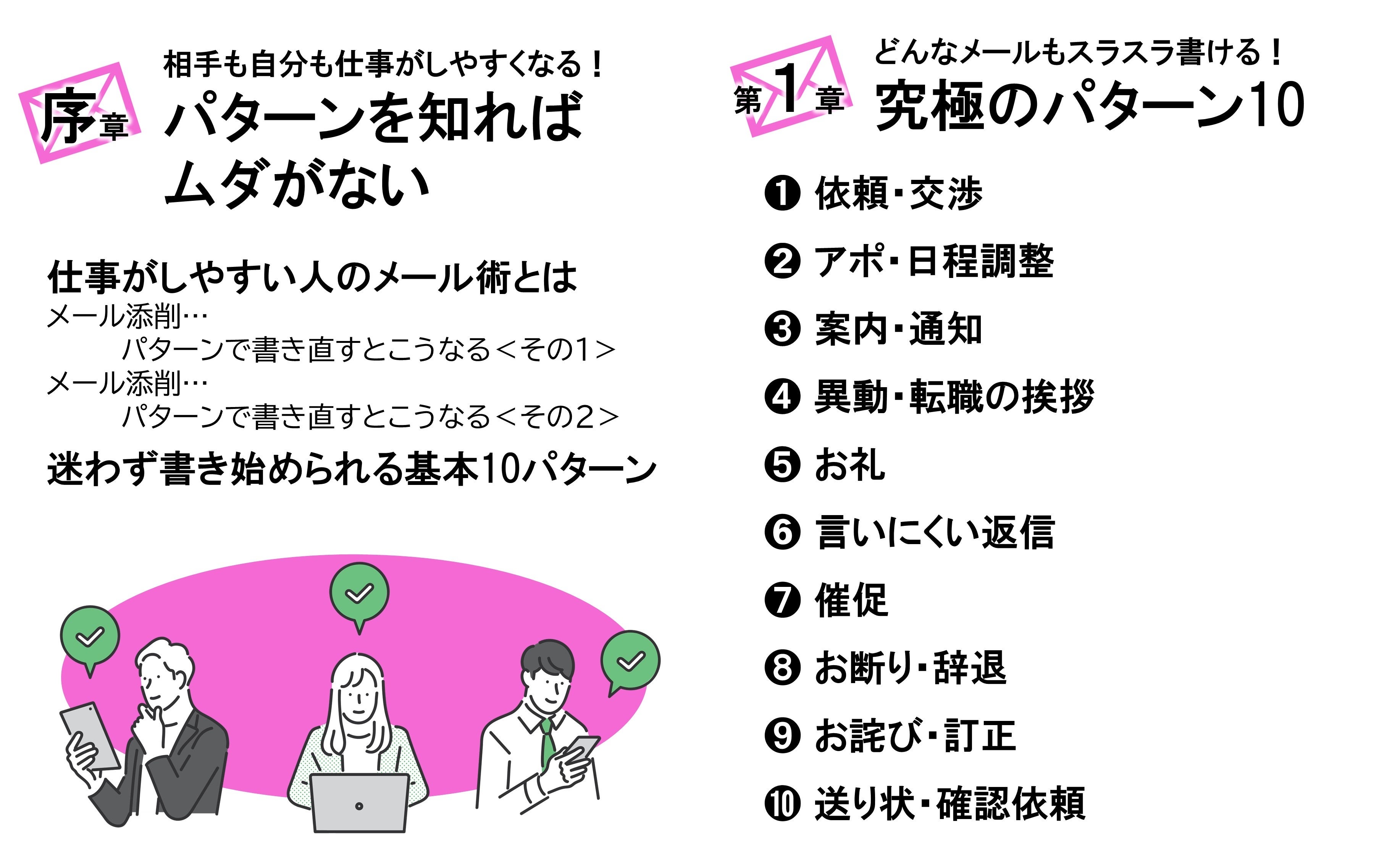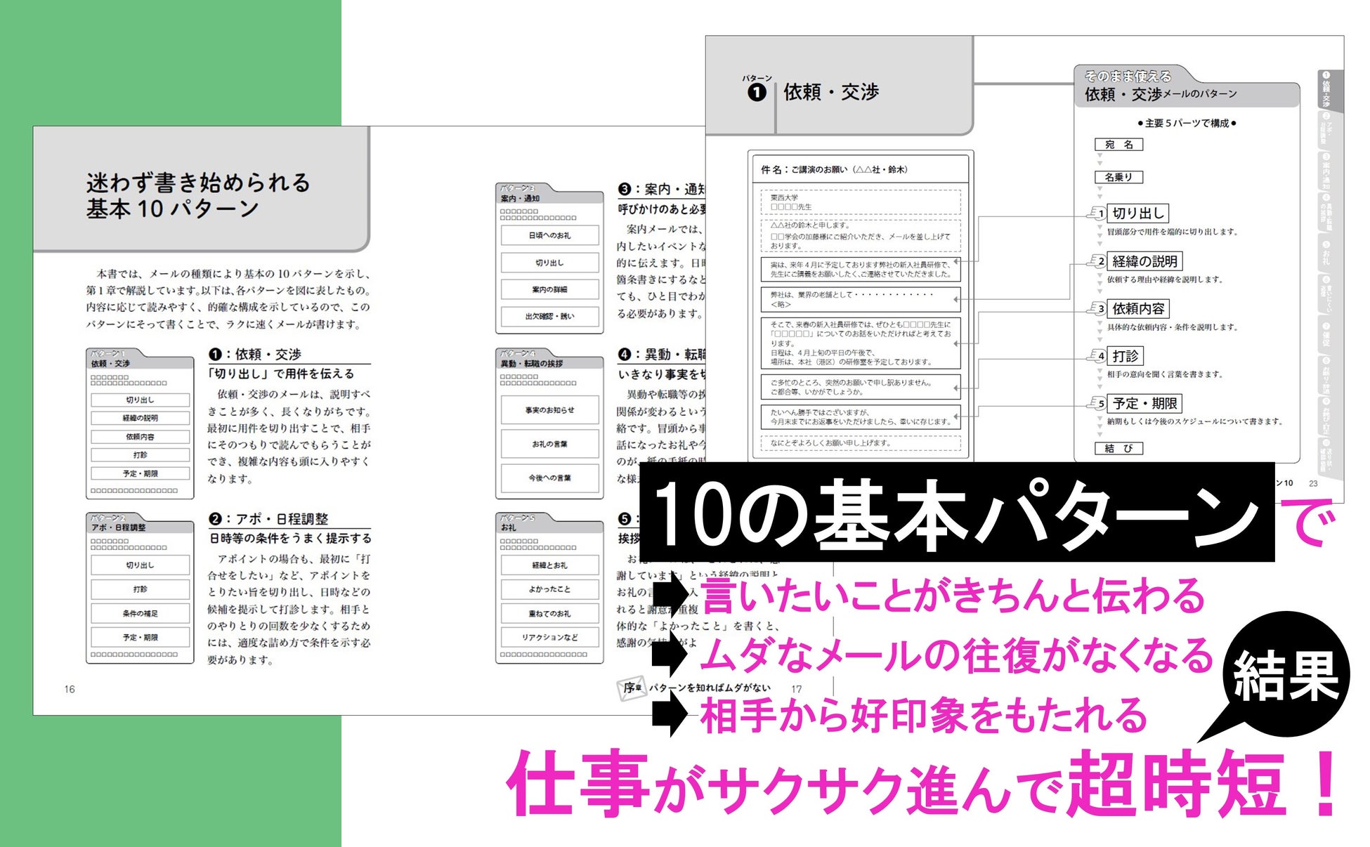 本書では、依頼・交渉・アポ・日程調整、案内・通知、お礼、言いにくい返信、催促など、あらゆる場面で使える10の基本パターンを紹介。このパターンに沿って書けば、込み入った内容でも、ムダなくすっきりと言いたいことを相手に伝えることができるようになります。