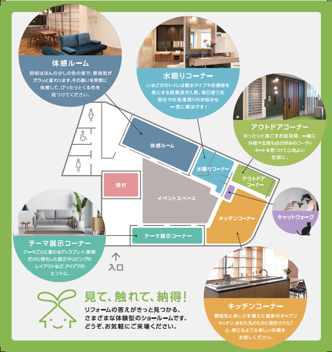 展示設備は、実演できるオープンキッチンや最新のユニットバス、トイレのほか、アウトドアコーナーに防犯や断熱対策を体感できる設備を展示、生活に必要な実用性の高い商品を季節ごとに入れ替えます。
