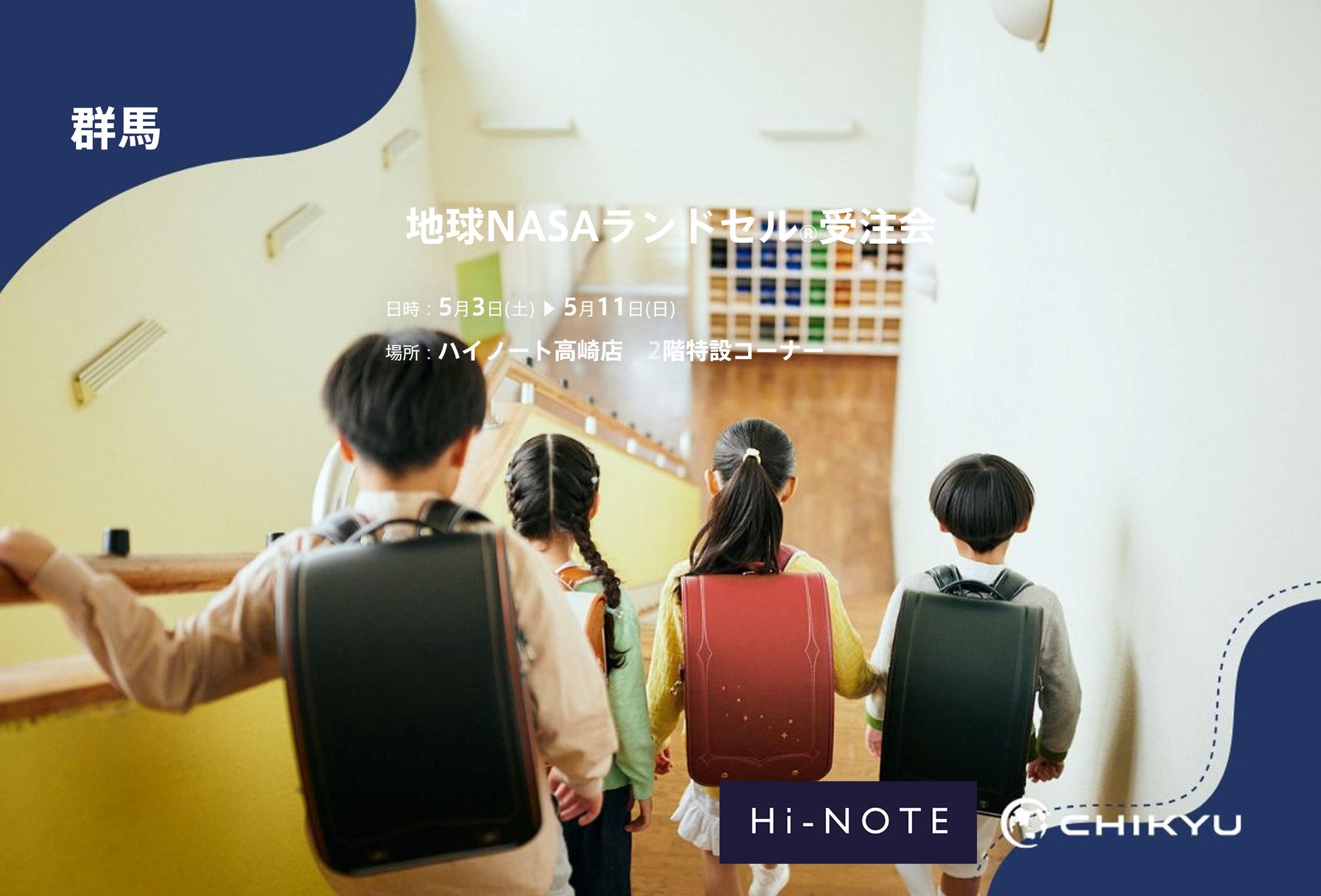 ランドセルの企画・販売を行うCHIKYU株式会社(東京都港区、代表取締役:村尾光一)は、群馬・ハイノート高崎店にて「地球NASAランドセル®受注会」を開催いたします。