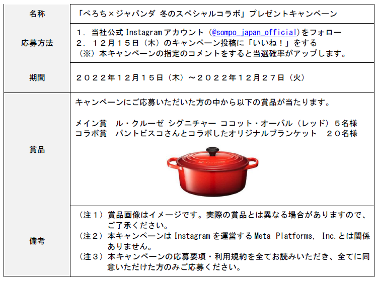 損害保険ジャパン株式会社(取締役社長:白川 儀一、以下「損保ジャパン」)は、2022年12月15日(木)から12月27日(火)まで損保ジャパン公式Instagramアカウントで、「ぺろち×ジャパンダ 冬のスペシャルコラボ」プレゼントキャンペーンを実施します。