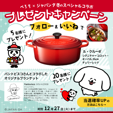 この度、クリエイターのパントビスコさんとジャパンダがコラボし、寒い冬を楽しく過ごせるよう、この季節にぴったりの賞品を抽選でプレゼントするキャンペーンを実施します。