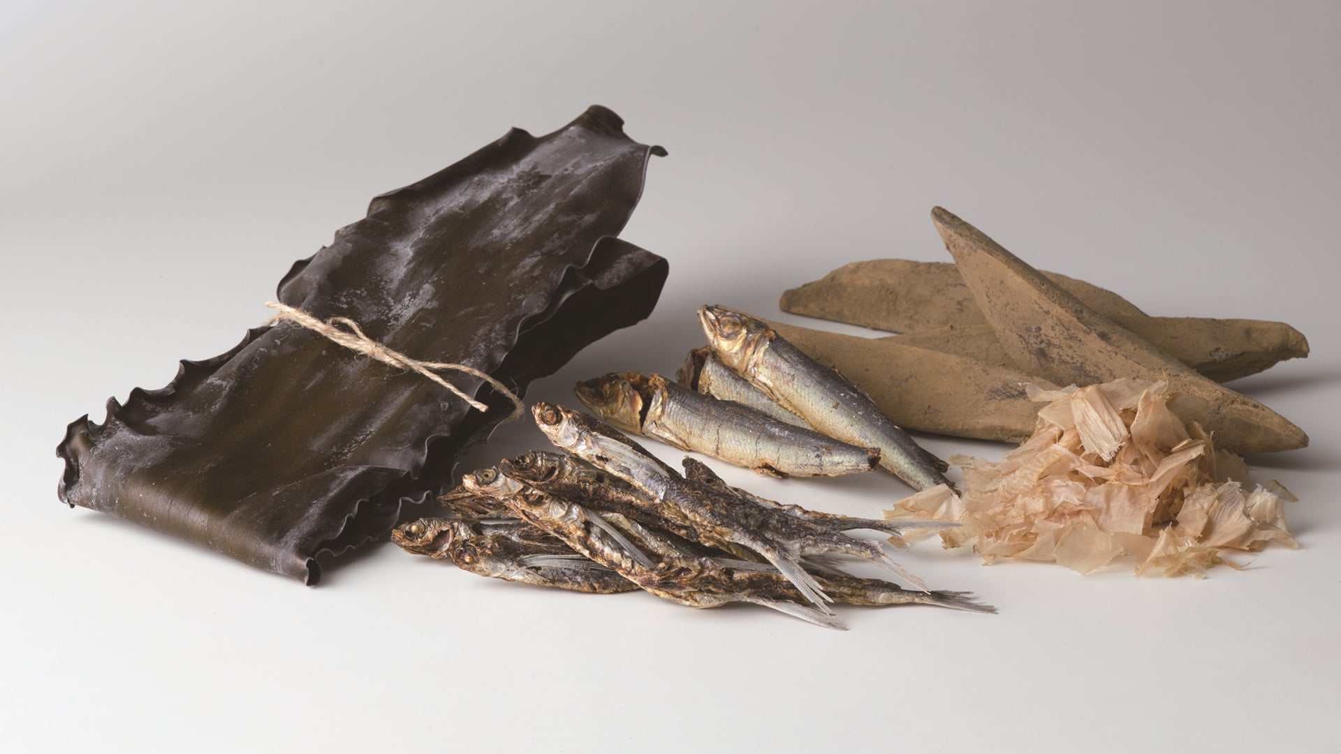 炭火焼きあご・枯れあご煮干し・本枯れ鰹節(血合い抜き)・鶏節・利尻昆布・どんこ椎茸・太白おぼろ昆布・へそ大根 など