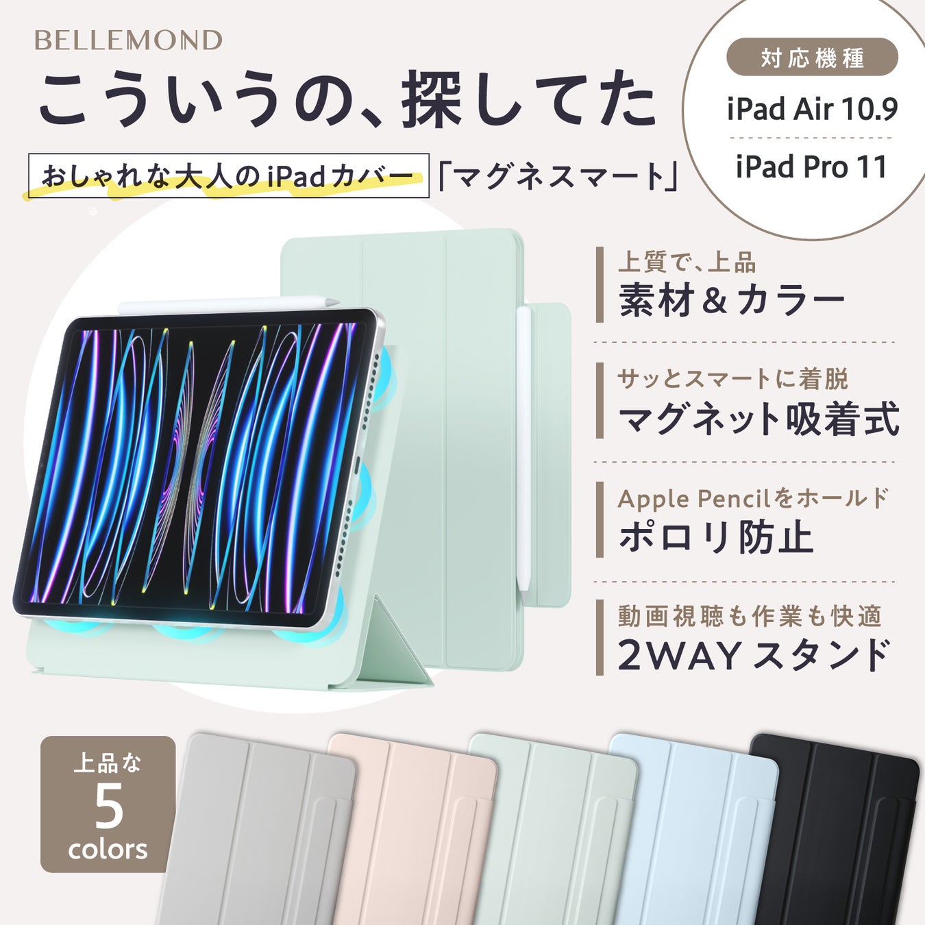 「大人かわいい、くすみカラー」オフィスもカフェも、あなたのiPadをおしゃれに彩るマグネット式でスマートなケース。持ち運び時にサッと着脱、ペン収納カバー付き。Air 第5世代、Pro 11インチ対応