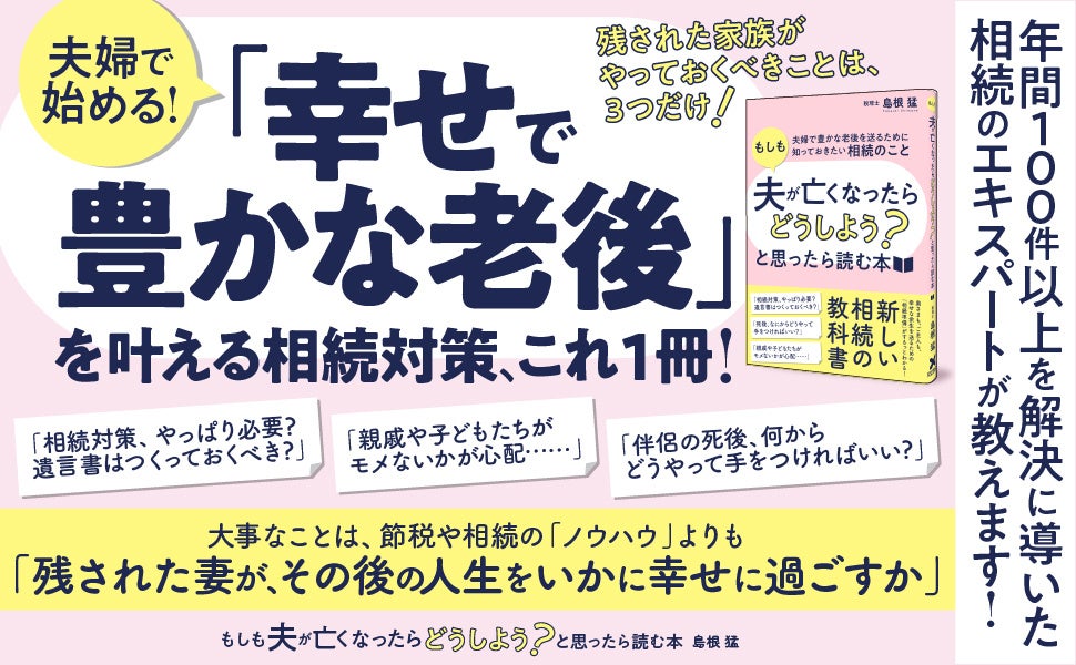 株式会社クロスメディア・パブリッシング(東京・渋谷区、代表取締役・小早川幸一郎)は、2023年1月16日に書籍『「もしも夫が亡くなったらどうしよう?」と思ったら読む本』(著者:島根 猛)を刊行します。平均寿命が延びて、女性のほうがより長生きになり、夫を送るケースは多くあります。本書は、著者の豊富な相談事例をベースに作成したケーススタディーを交え、相続の手続きをスムーズに進めるための準備や、実際に相続が発生したときの具体的な対応方法を丁寧に解説した一冊です。