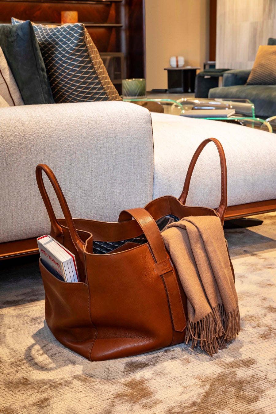 彫刻的な収納バッグ。外側はバターのように柔らかいレザー、内側はダイヤモンドシルク張り。