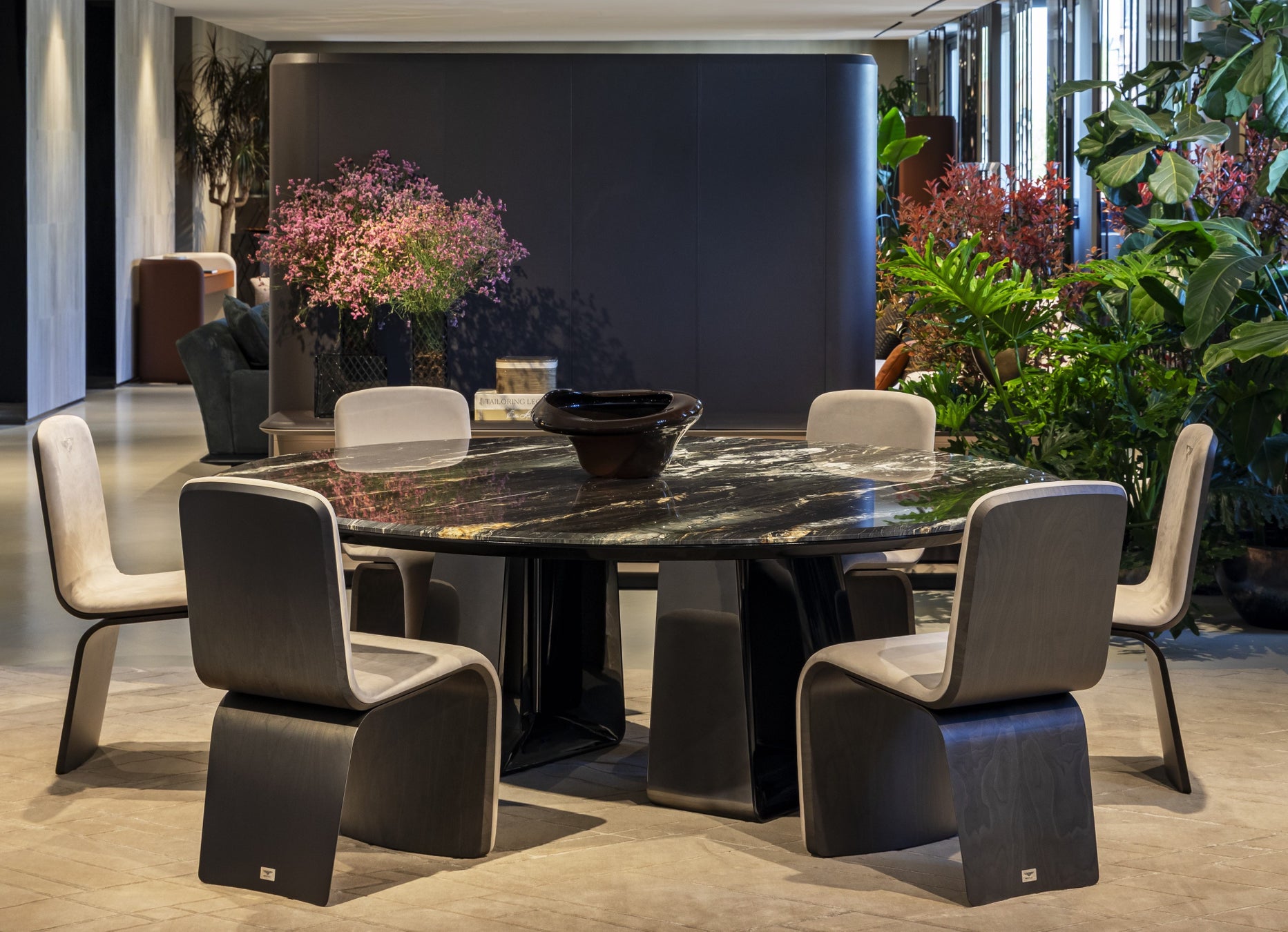 家具には、木材・大理石・カシミアなど自然由来の贅沢な素材を使用。マットな質感や異素材の組み合わせが、手触りでも楽しめる豊かな表情を生み出す
