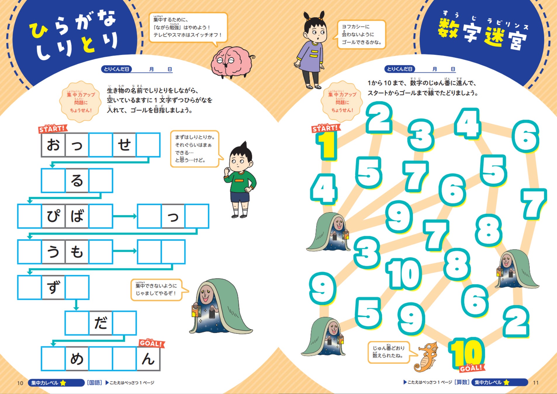 パズルや迷路などのバラエティ豊かなドリルで、お子さんがじっくり集中し、考える力が身につきます。集中力を妨げるモンスターたちが出題する数々の問題を解いて、少しずつ国語&算数の力、集中力レベルをアップ!