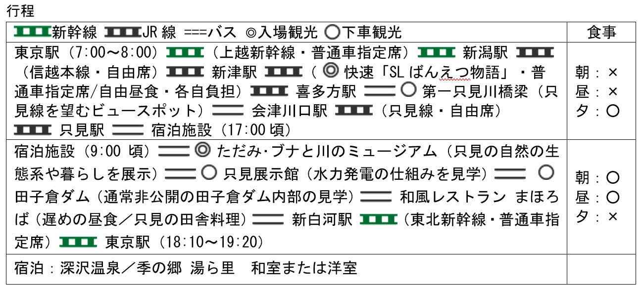 阿賀野川沿いを走る人気の「SLばんえつ物語」(新潟駅~喜多方駅)と山間ののどかなる車窓が広がる「只見線」(会津川口駅~只見駅)に乗車いたします。