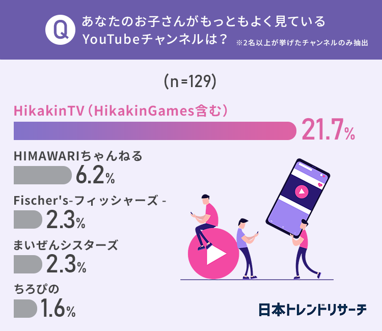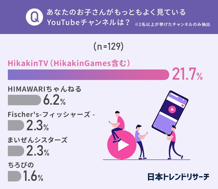子供がよく見ているYouTubeチャンネルとしては「HikakinTV」がもっとも人気があり、そのほかには「マイクラ」のゲーム実況も人気を集めました。