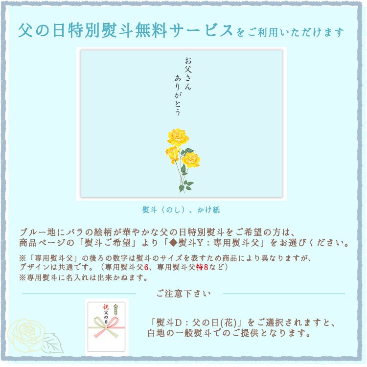 今年もブルー地にバラの絵柄が華やかな「父の日 特別熨斗」無料サービスをご用意いたしました。
