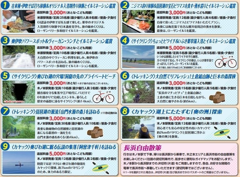 西日本旅客鉄道株式会社、株式会社日本旅行、鉄道を活かした湖北地域振興協議会では、滋賀県湖北の秋ならではの魅力を感じることができる、団体臨時列車ツアーを実施いたします。今回のツアーではアドベンチャーをテーマに、琵琶湖でのカヤックやサイクリング、トレッキング、マス釣り、そば打ちなど、ユニークな体験をオプショナルツアーとしてご用意しました。フリープランの方にも長浜おでかけパスポートやミールクーポンがセットされ、北国街道木之本宿や黒壁スクエアなど、1日たっぷり湖北エリアの散策ができます。ぜひこの機会に鉄道に乗って、ベストシーズンの湖北の秋をお楽しみください。