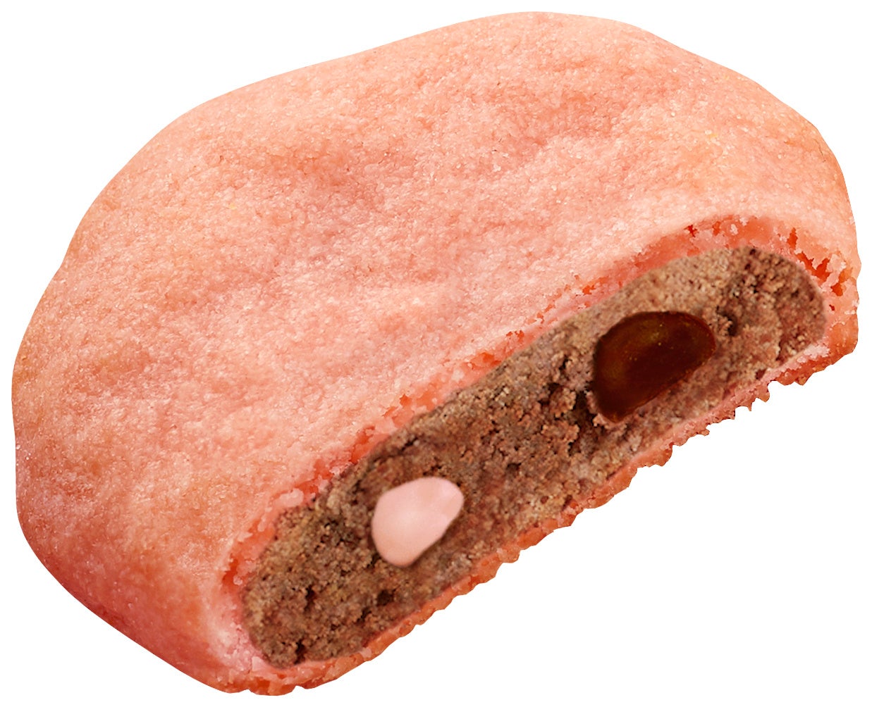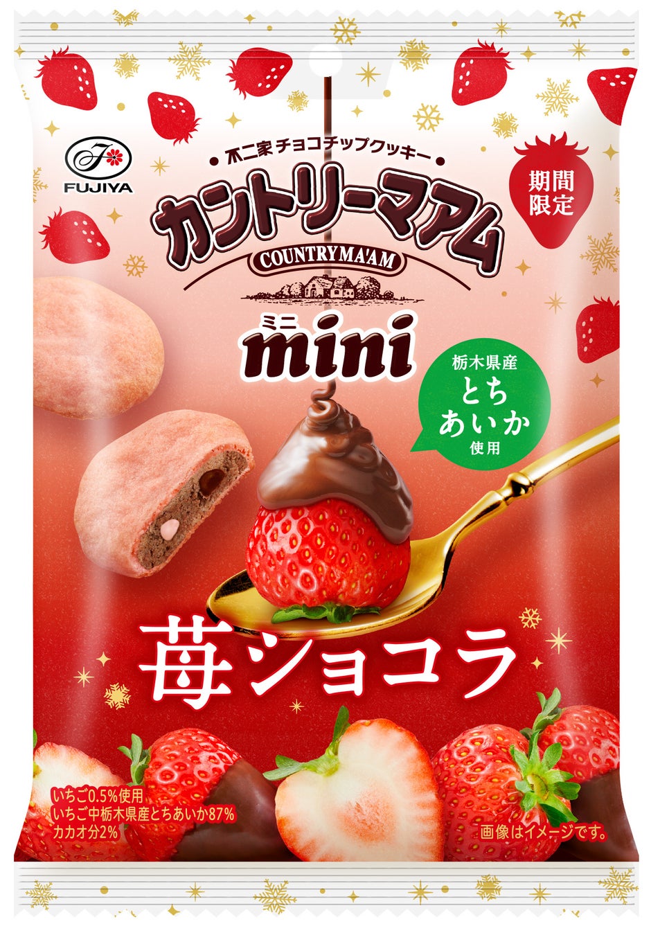 ・栃木県産「とちあいか」のピューレとコク深いオランダ産ココアを練り込んだ生地に、苺風味チップとスイートチョコチップを合わせて焼き上げた、期間限定カントリーマアム