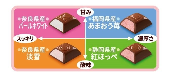・福岡県産「あまおう苺」、静岡県産「紅ほっぺ」、奈良県産「淡雪」、奈良県産「パールホワイト」の4種のブランド苺をそれぞれ使用したクリームをミルクチョコレートで包んだ、苺の味わいの違いを食べくらべて楽しめるルック