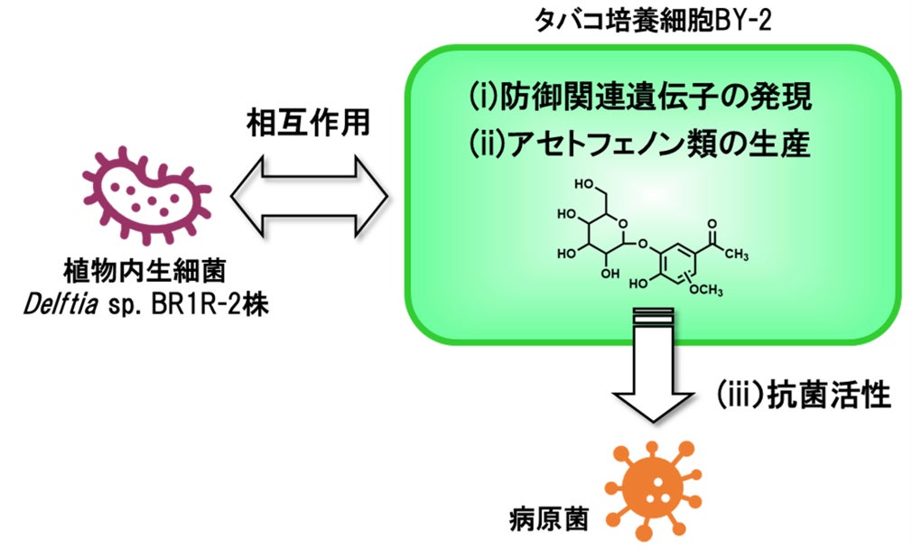以上の結果より、BR1R-2株とBY-2 細胞の共培養によって、(i) BY-2細胞の防御関連遺伝子の発現が増加、(ii) アセトフェノン類の生産が誘導され、(iii) 細胞抽出物の抗菌活性が高まっていることが明らかになりました(図3)。このことから、タバコ培養細胞は植物内生細菌との相互作用により、免疫応答の一環として抗菌活性などの優れた性質を持つアセトフェノン類を生産することが示唆されました。
