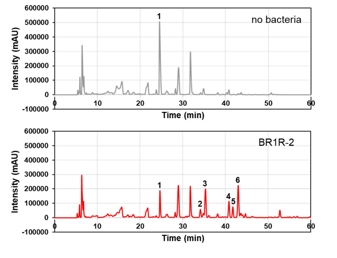 さらに、共培養したBY-2 細胞の代謝産物を高速液体クロマトグラフィー(*3)で解析した結果、代謝産物のプロファイルが大きく変化していることを確認しました(図2)。有意に増加した化合物を調査したところ、化合物はアセトフェノン(*4)誘導体または構造異性体であると推定されました。これより、BR1R-2株は植物培養細胞の増殖を妨げることなく代謝を大きく変化させられることが明らかになりました。