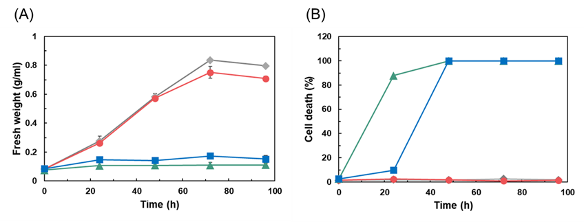 単独培養では得られない化合物を生産できる手法として、異なる二種類以上の細胞や微生物を同時に培養し、それらの相互作用を利用する共培養技術があります。これまで、微生物同士の共培養が広く研究されてきた一方で、微生物と植物培養細胞の共培養の研究は微生物同士の共培養ほど進んでいません。その理由の一つとして、微生物が植物培養細胞の増殖を阻害し、細胞死を引き起こしやすいことがあります。